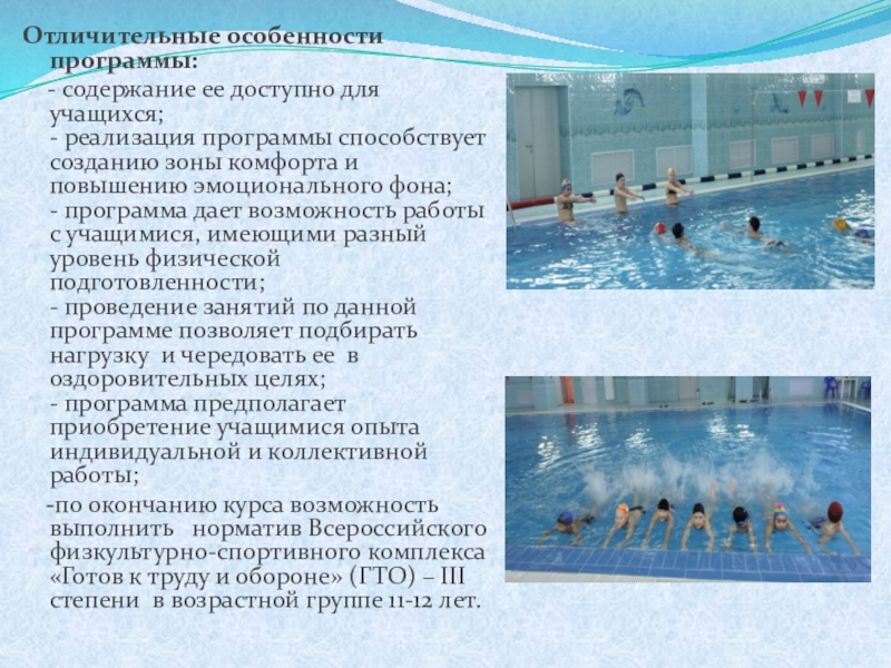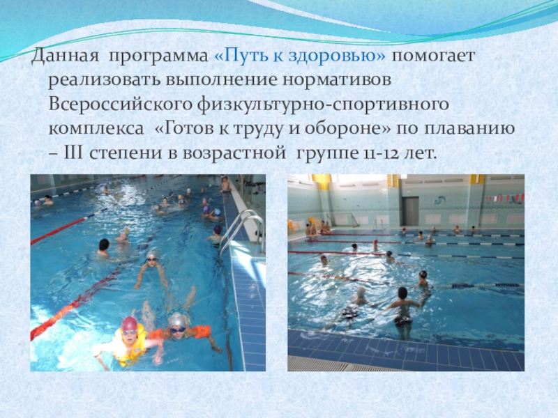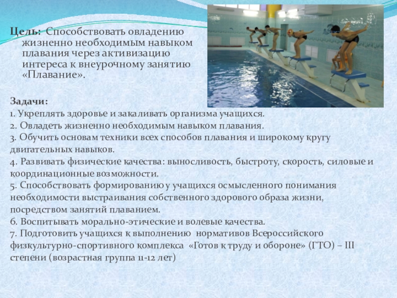 5. Способствовать формированию у учащихся осмысленного понимания необходимости выстраивания собственного здорового образа жизни, посредством занятий плаванием.