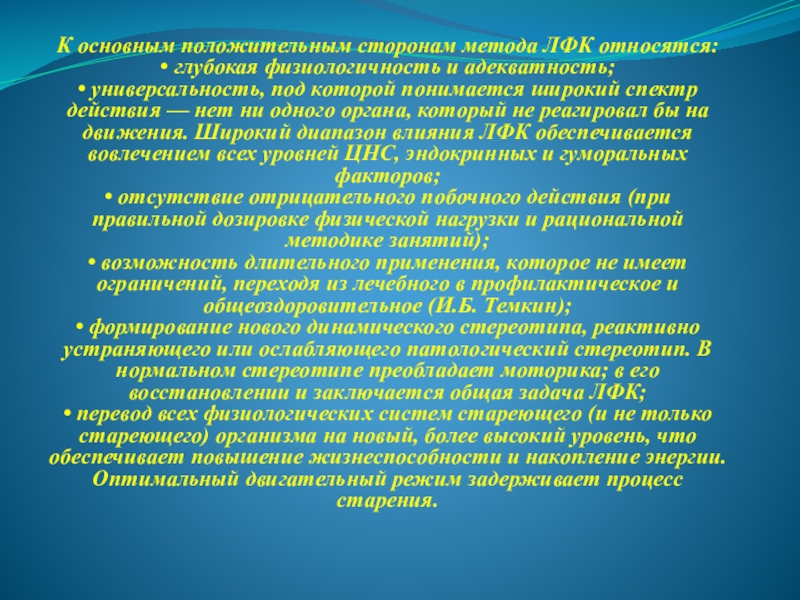 • возможность длительного применения, которое не имеет ограничений, переходя из лечебного в профилактическое и общеоздоровительное (И.Б. Темкин);
