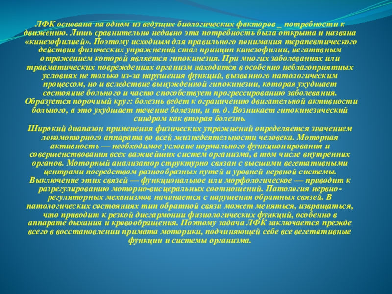 Слайд 13ЛФК основана на одном из ведущих биологических факторов _ потребности к