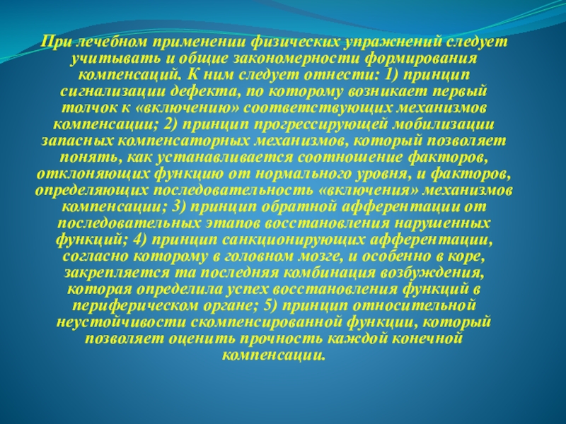 компенсаций. К ним следует отнести: 1) принцип сигнализации дефекта, по которому возникает первый толчок к «включению» соответствующих механизмов компенсации; 2) принцип прогрессирующей мобилизации запасных компенсаторных механизмов, который позволяет понять, как устанавливается соотношение факторов, отклоняющих функцию от нормального уровня, и факторов, определяющих последовательность «включения» механизмов компенсации; 3) принцип обратной афферентации от последовательных этапов восстановления нарушенных функций; 4) принцип санкционирующих афферентации, согласно которому в головном мозге, и особенно в коре, закрепляется та последняя комбинация возбуждения, которая определила успех восстановления функций в периферическом органе; 5) принцип относительной неустойчивости скомпенсированной функции, который позволяет оценить прочность каждой конечной компенсации.