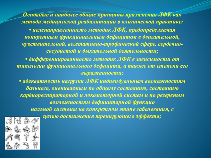 Слайд 7Основные и наиболее общие принципы применения ЛФК как метода медицинской реабилитации