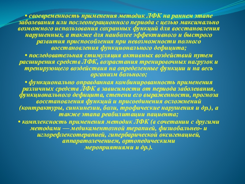 Слайд 9• своевременность применения методик ЛФК на раннем этапе заболевания или послеоперационного