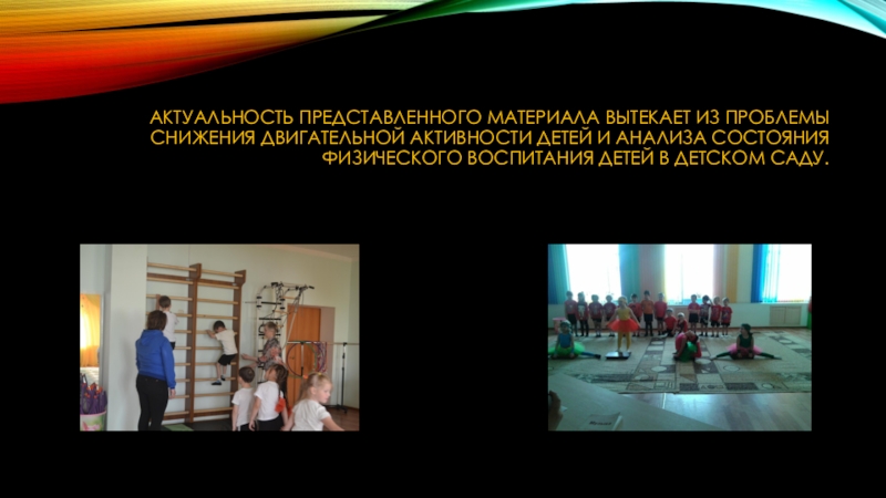 Слайд 6Актуальность представленного материала вытекает из проблемы снижения двигательной активности детей и