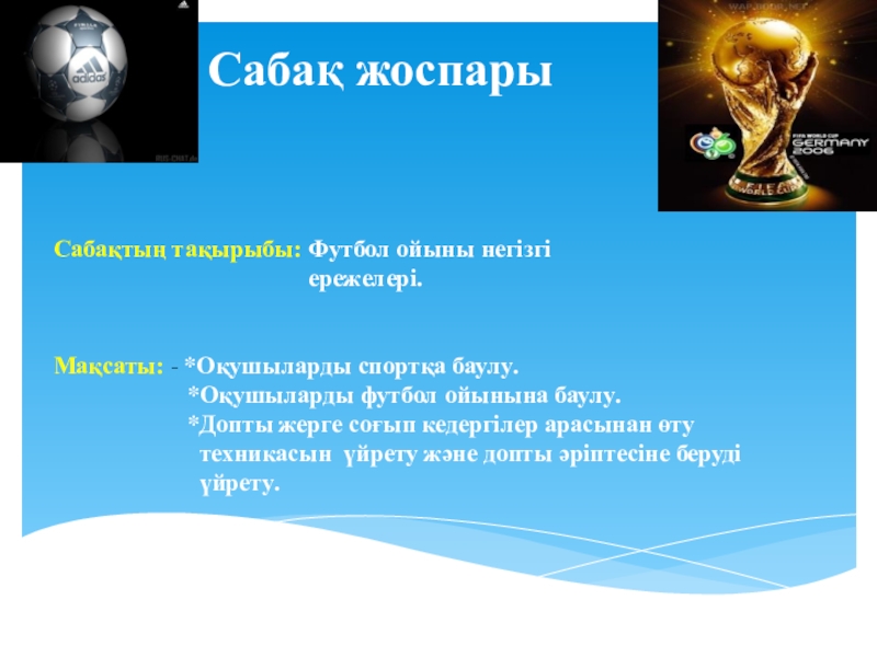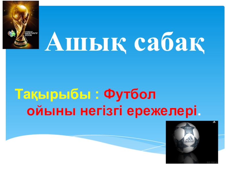 Презентация, доклад на тему Сабақтың тақырыбы: Футбол ойыны негізгі ережелері. Сабақтың мақсаты: Футбол ойынындағы ең негізігі ережелерді үйрену.
