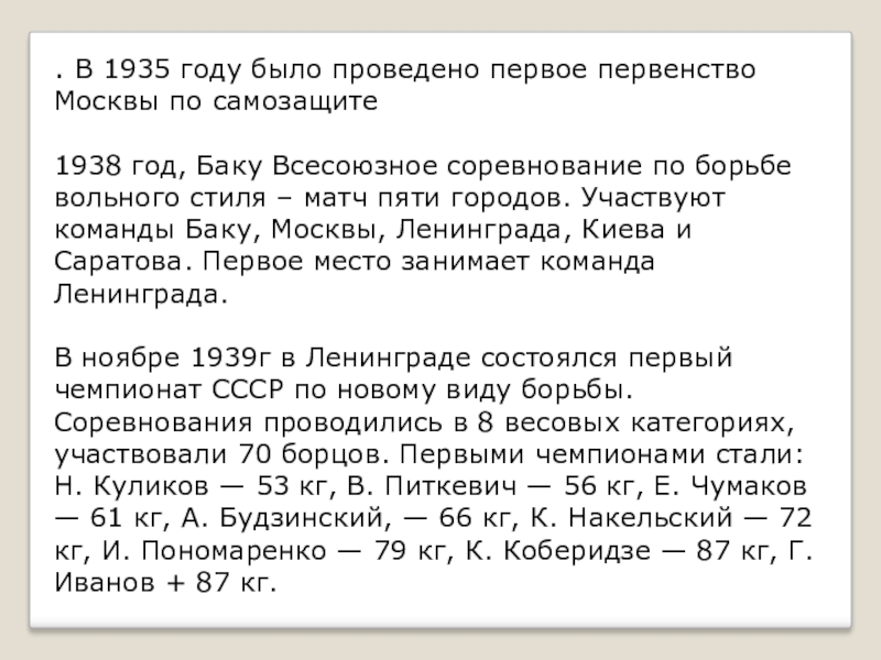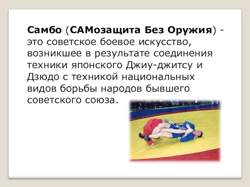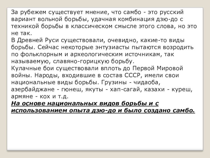С 1930 года В.С.Ощепков работал в московском институте физкультуры, преподавая борьбу дзю-до. В.С.Ощепков пошел дальше и стал переделывать старинную систему, применяя ее к новым Советским условиям. Он же заменил кимоно и традиционные брюки на специальные борцовские куртки и обыкновенные спортивные трусы, а на ноги предложил надеть борцовские ботинки с мягкими рантами, стал проводить открытые соревнования по новой усовершенствованной системе, которую называли тогда борьба вольного (имелось ввиду свободного) стиля.