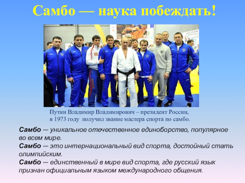 Слайд 18Самбо — уникальное отечественное единоборство, популярное во всем мире.