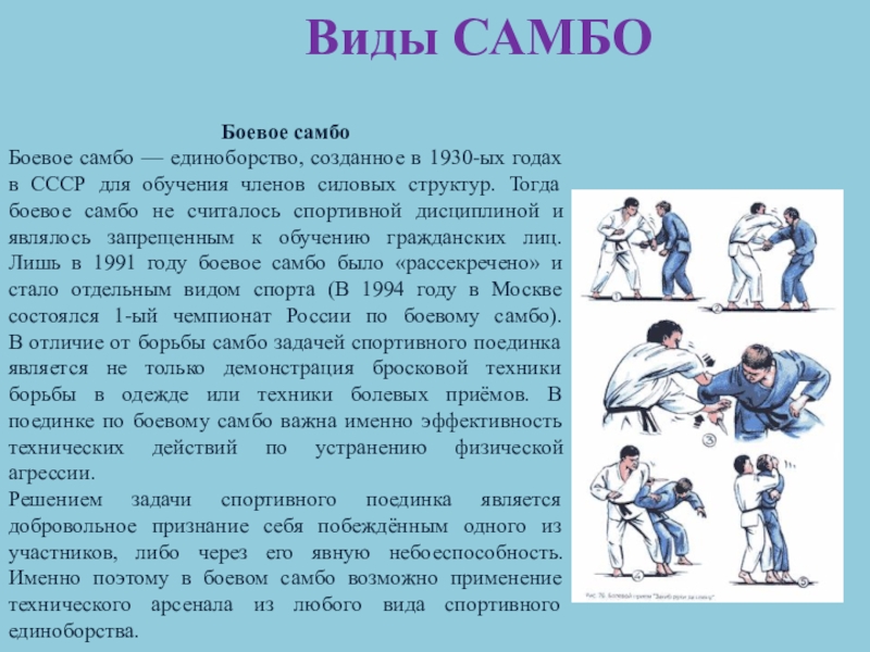 СССР для обучения членов силовых структур. Тогда боевое самбо не считалось спортивной дисциплиной и являлось запрещенным к обучению гражданских лиц. Лишь в 1991 году боевое самбо было «рассекречено» и стало отдельным видом спорта (В 1994 году в Москве состоялся 1-ый чемпионат России по боевому самбо).