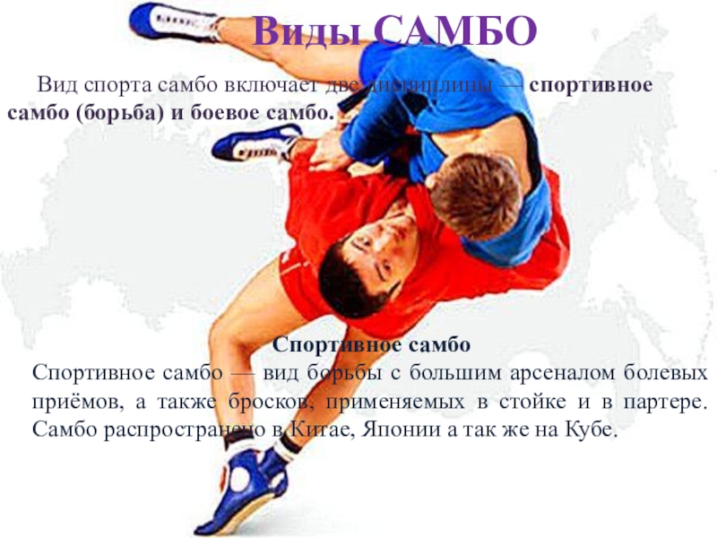 Вид спорта самбо включает две дисциплины — спортивное самбо (борьба) и боевое самбо.