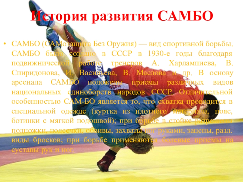 было создано в СССР в 1930-е годы благодаря подвижнической работе тренеров А. Харлампиева, В. Спиридонова, И. Васильева, В. Маслова и др. В основу арсенала САМБО положены приемы различных видов национальных единоборств народов СССР. Отличительной особенностью САМ-БО является то, что схватка проводится в специальной одежде (куртка из плотного материала, пояс, ботинки с мягкой подошвой); при борьбе в стойке разрешены подножки, подсечки, обвивы, захваты ног руками, зацепы, разл. виды бросков; при борьбе применяются болевые приемы на суставы рук и ног.