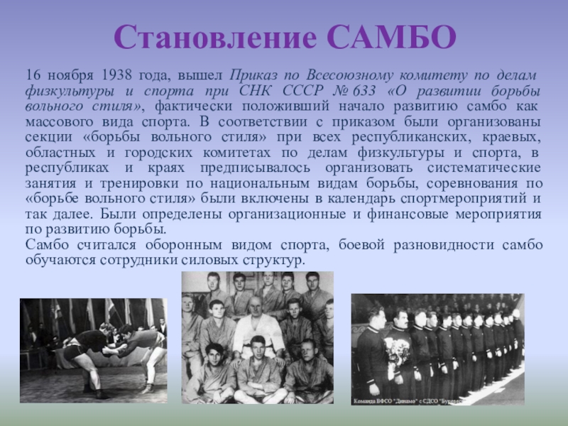 делам физкультуры и спорта при СНК СССР № 633 «О развитии борьбы вольного стиля», фактически положивший начало развитию самбо как массового вида спорта. В соответствии с приказом были организованы секции «борьбы вольного стиля» при всех республиканских, краевых, областных и городских комитетах по делам физкультуры и спорта, в республиках и краях предписывалось организовать систематические занятия и тренировки по национальным видам борьбы, соревнования по «борьбе вольного стиля» были включены в календарь спортмероприятий и так далее. Были определены организационные и финансовые мероприятия по развитию борьбы.