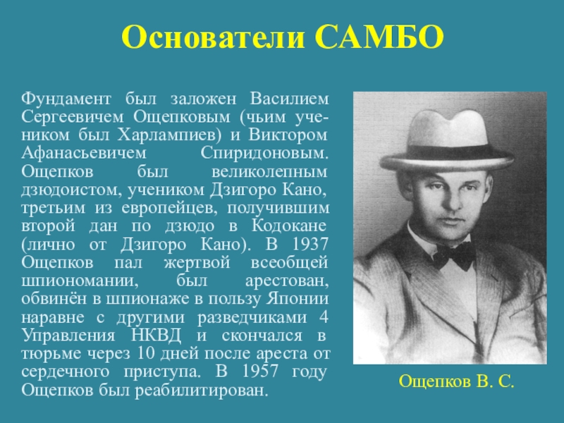 и Виктором Афанасьевичем Спиридоновым. Ощепков был великолепным дзюдоистом, учеником Дзигоро Кано, третьим из европейцев, получившим второй дан по дзюдо в Кодокане (лично от Дзигоро Кано). В 1937 Ощепков пал жертвой всеобщей шпиономании, был арестован, обвинён в шпионаже в пользу Японии наравне с другими разведчиками 4 Управления НКВД и скончался в тюрьме через 10 дней после ареста от сердечного приступа. В 1957 году Ощепков был реабилитирован.