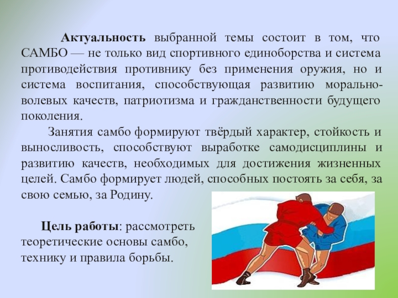 Слайд 2 Актуальность выбранной темы состоит в том, что САМБО —
