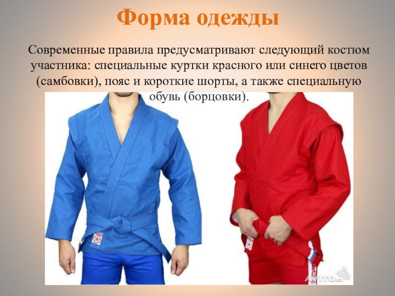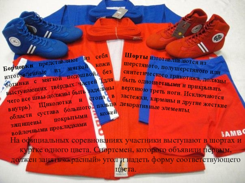 цветов (самбовки), пояс и короткие шорты, а также специальную обувь (борцовки).