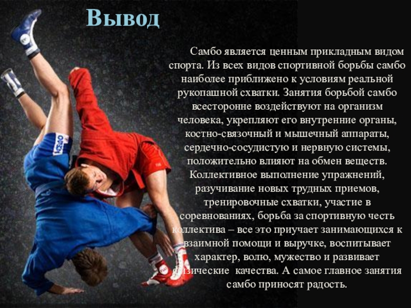 самбо наиболее приближено к условиям реальной рукопашной схватки. Занятия борьбой самбо всесторонне воздействуют на организм человека, укрепляют его внутренние органы, костно-связочный и мышечный аппараты, сердечно-сосудистую и нервную системы, положительно влияют на обмен веществ. Коллективное выполнение упражнений, разучивание новых трудных приемов, тренировочные схватки, участие в соревнованиях, борьба за спортивную честь коллектива – все это приучает занимающихся к взаимной помощи и выручке, воспитывает характер, волю, мужество и развивает физические качества. А самое главное занятия самбо приносят радость.