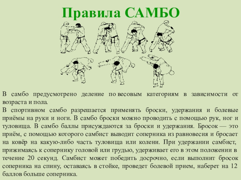 В спортивном самбо разрешается применять броски, удержания и болевые приёмы на руки и ноги. В самбо броски можно проводить с помощью рук, ног и туловища. В самбо баллы присуждаются за броски и удержания. Бросок — это приём, с помощью которого самбист выводит соперника из равновесия и бросает на ковёр на какую-либо часть туловища или колени. При удержании самбист, прижимаясь к сопернику головой или грудью, удерживает его в этом положении в течение 20 секунд. Самбист может победить досрочно, если выполнит бросок соперника на спину, оставаясь в стойке, проведет болевой прием, наберет на 12 баллов больше соперника.