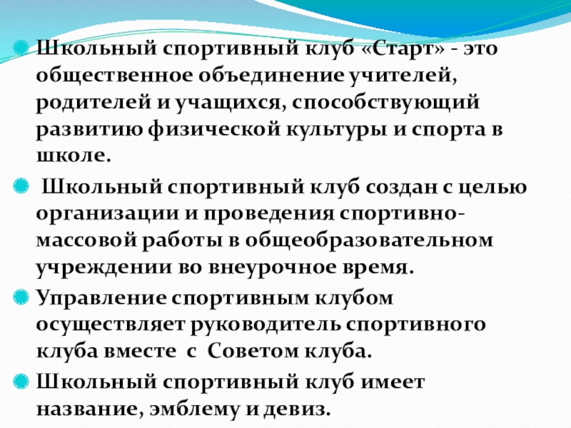 Слайд 4Школьный спортивный клуб «Старт» - это общественное объединение учителей, родителей и учащихся,