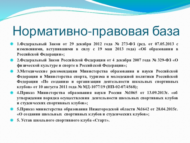 5.Приказ министерства образования Нижегородской области №1642 от 28.04.2015г. «О создании школьных спортивных клубов и студенческих клубов»;