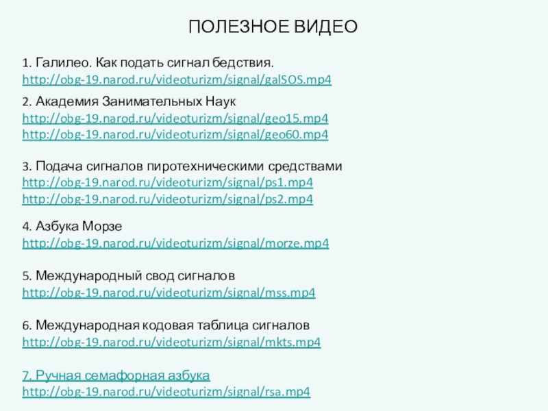 http://obg-19.narod.ru/videoturizm/signal/galSOS.mp4http://obg-19.narod.ru/videoturizm/signal/geo15.mp4http://obg-19.narod.ru/videoturizm/signal/geo60.mp4http://obg-19.narod.ru/videoturizm/signal/ps1.mp4http://obg-19.narod.ru/videoturizm/signal/ps2.mp4http://obg-19.narod.ru/videoturizm/signal/morze.mp4http://obg-19.narod.ru/videoturizm/signal/mss.mp4http://obg-19.narod.ru/videoturizm/signal/mkts.mp47. Ручная семафорная азбукаhttp://obg-19.narod.ru/videoturizm/signal/rsa.mp4