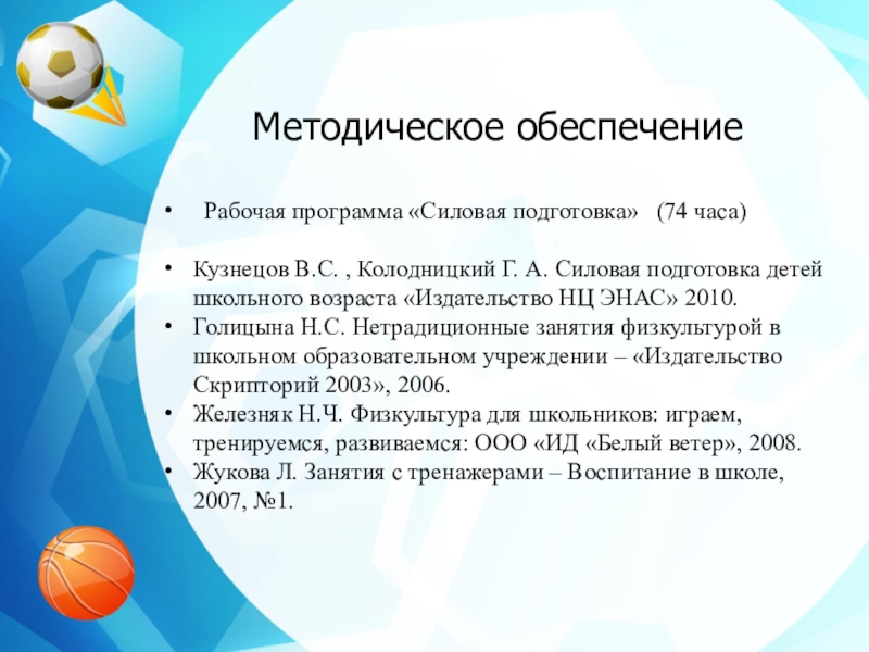 Методическое обеспечениеРабочая программа «Силовая подготовка»  (74 часа)Кузнецов В.С. , Колодницкий Г. А. Силовая подготовка детей школьного