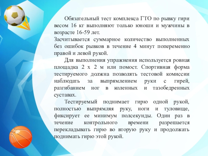 Обязательный тест комплекса ГТО по рывку гири весом 16