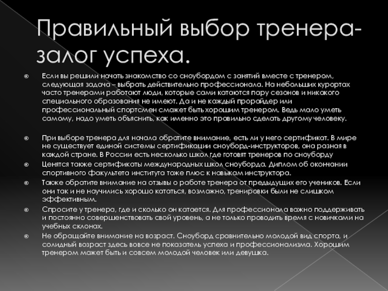Для одних достаточно уметь съезжать со сравнительно пологих склонов, чтобы пару раз за зиму выехать с друзьями за компанию покататься. А другим необходим адреналин, высокие скорости, сложные трюки паркового катания или нетронутые склоны для фрирайда. Это требует разного уровня владения техникой, поэтому подход к обучению катанию на сноуборде для каждого человека индивидуальный.
