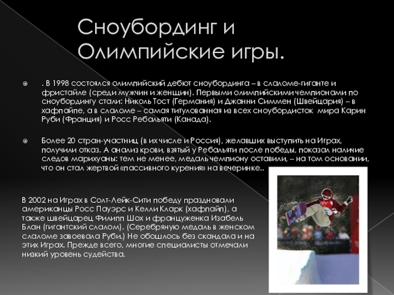 В 2002 на Играх в Солт-Лейк-Сити победу праздновали американцы Росс Пауэрс и Келли Кларк (хафпайп), а также швейцарец Филипп Шох и француженка Изабель Блан (гигантский слалом). (Серебряную медаль в женском слаломе завоевала Руби.) Не обошлось без скандала и на этих Играх. Прежде всего, многие специалисты отмечали низкий уровень судейства.