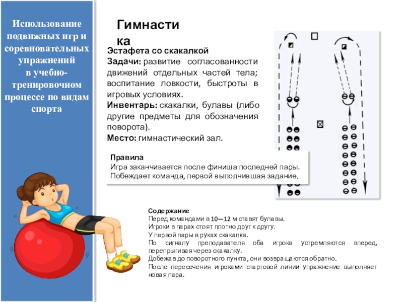 Инвентарь: скакалки, булавы (либо другие предметы для обозначения поворота).