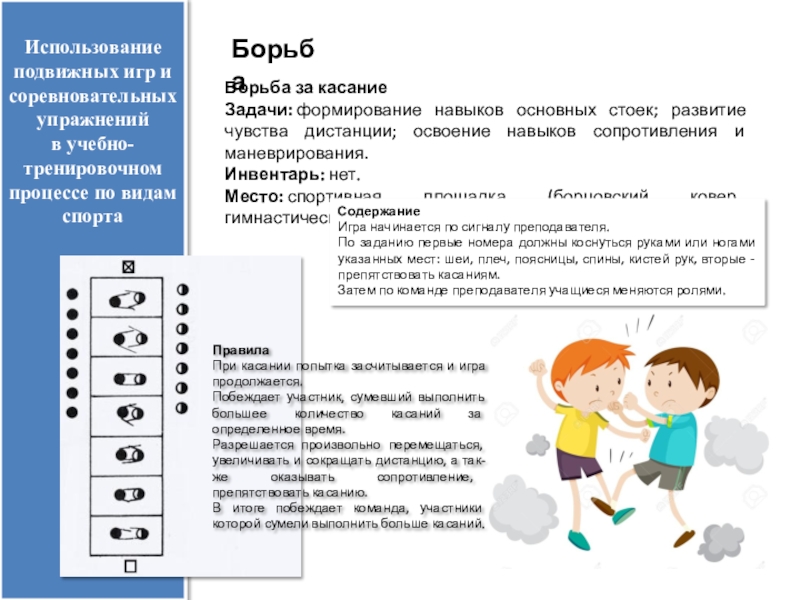 Задачи: формирование навыков основных стоек; развитие чувства дистанции; освоение навыков сопротивления и маневрирования.