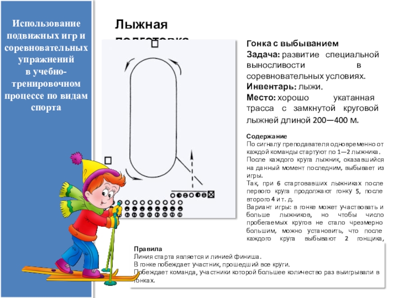 Место: хорошо укатанная трасса с замкнутой круговой лыжней длиной 200—400 м.