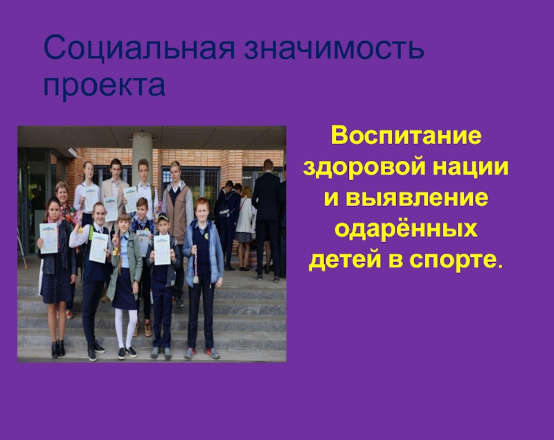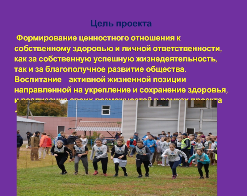 как за собственную успешную жизнедеятельность, так и за благополучное развитие общества. Воспитание активной жизненной позиции направленной на укрепление и сохранение здоровья, и реализация своих возможностей в рамках проекта «Физкультура, школа, я – одна спортивная семья»