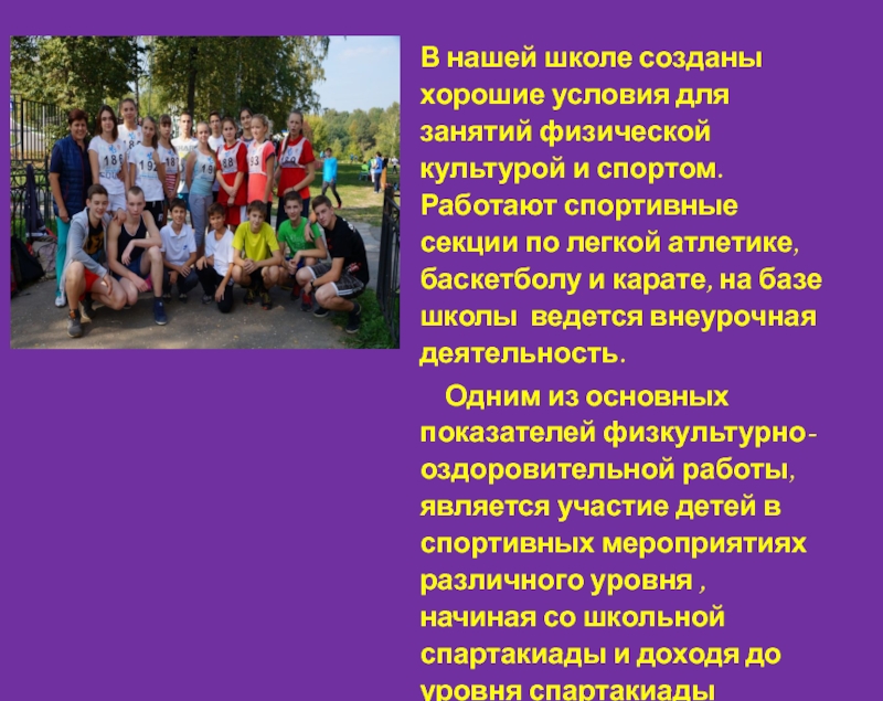и спортом. Работают спортивные секции по легкой атлетике, баскетболу и карате, на базе школы ведется внеурочная деятельность.
