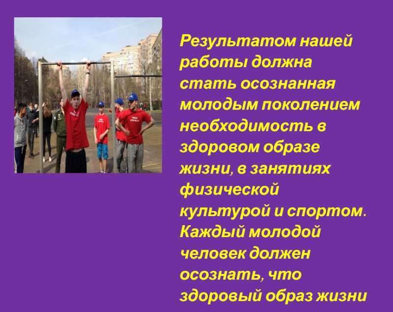 Слайд 2Результатом нашей работы должна стать осознанная молодым поколением необходимость в здоровом