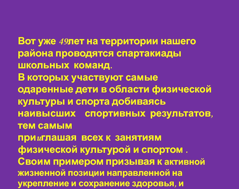 Слайд 25Вот уже 49лет на территории нашего района проводятся спартакиады школьных команд.