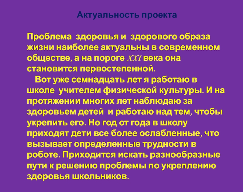 Вот уже семнадцать лет я работаю в школе учителем физической культуры. И на протяжении многих лет наблюдаю за здоровьем детей и работаю над тем, чтобы укрепить его. Но год от года в школу приходят дети все более ослабленные, что вызывает определенные трудности в роботе. Приходится искать разнообразные пути к решению проблемы по укреплению здоровья школьников.