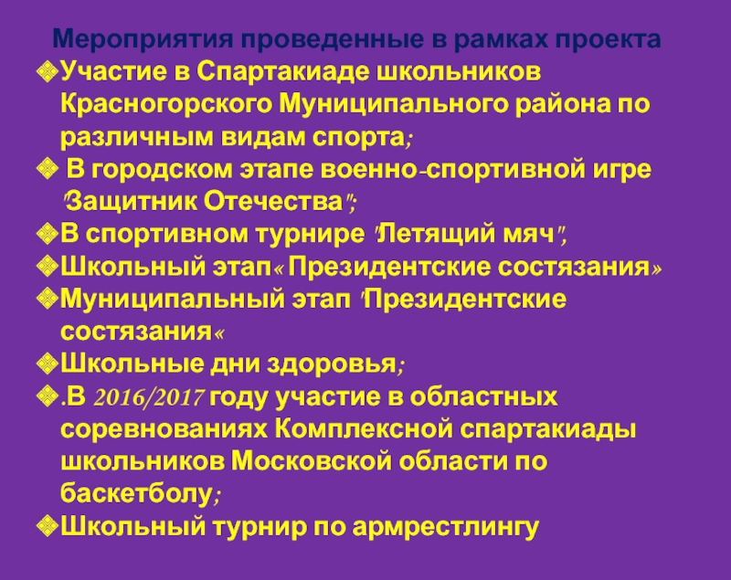 Одним из основных показателей физкультурно-оздоровительной работы, является участие детей в спортивных мероприятиях различного уровня , начиная со школьной спартакиады и доходя до уровня спартакиады школьников Красногорского района , а затем и областных соревнований.