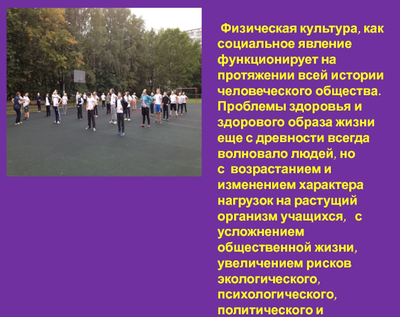 человеческого общества. Проблемы здоровья и здорового образа жизни еще с древности всегда волновало людей, но с возрастанием и изменением характера нагрузок на растущий организм учащихся, с усложнением общественной жизни, увеличением рисков экологического, психологического, политического и военного характера, провоцирующих негативные сдвиги в состоянии здоровья, стала наиболее актуальна в современном обществе.