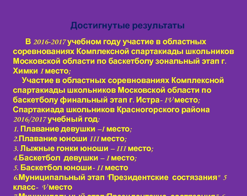 .В 2016/2017 году участие в областных соревнованиях Комплексной спартакиады школьников Московской области по баскетболу;