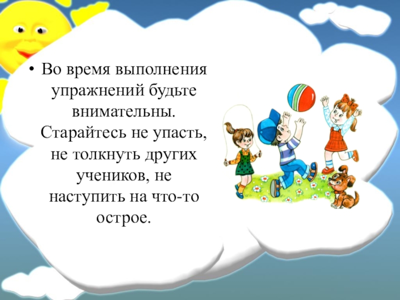 Слайд 6Во время выполнения упражнений будьте внимательны. Старайтесь не упасть, не толкнуть