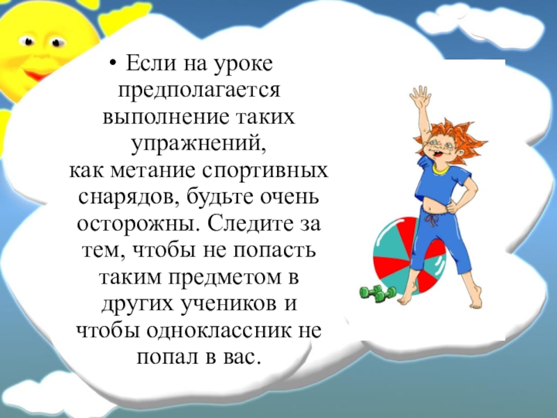 как метание спортивных снарядов, будьте очень осторожны. Следите за тем, чтобы не попасть таким предметом в других учеников и чтобы одноклассник не попал в вас.