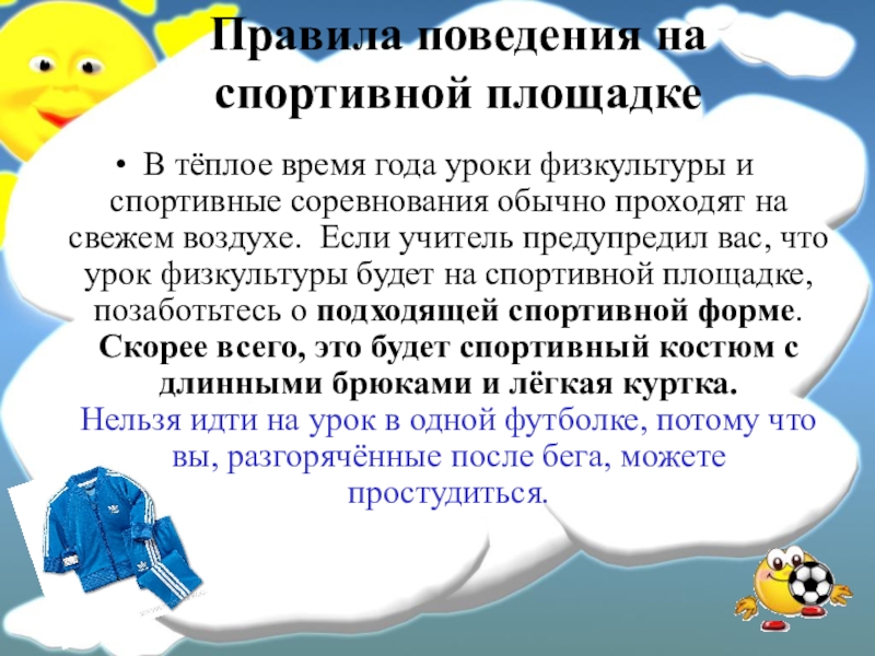 Правила поведения на спортивной площадке В тёплое время года уроки физкультуры и спортивные соревнования обычно проходят на