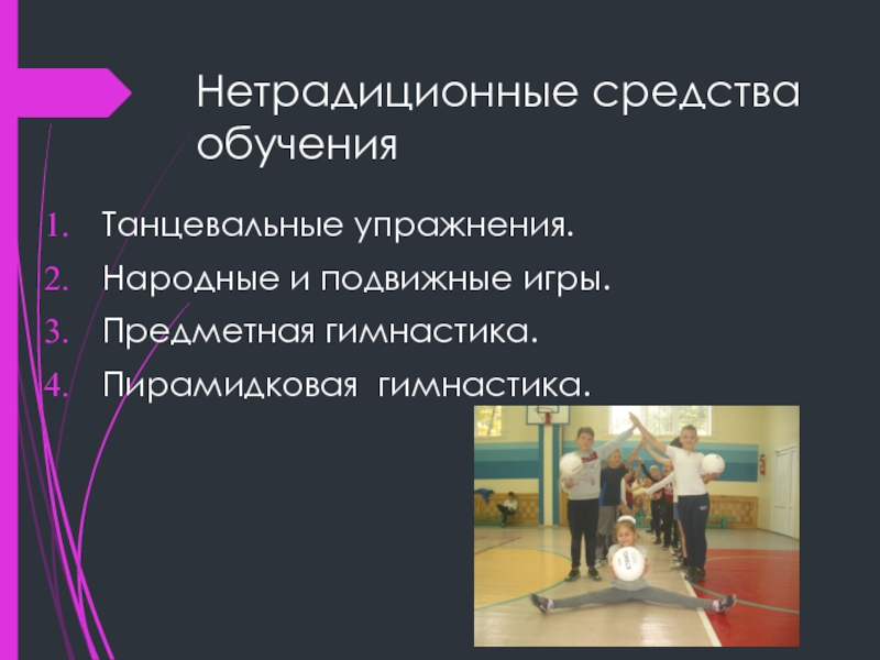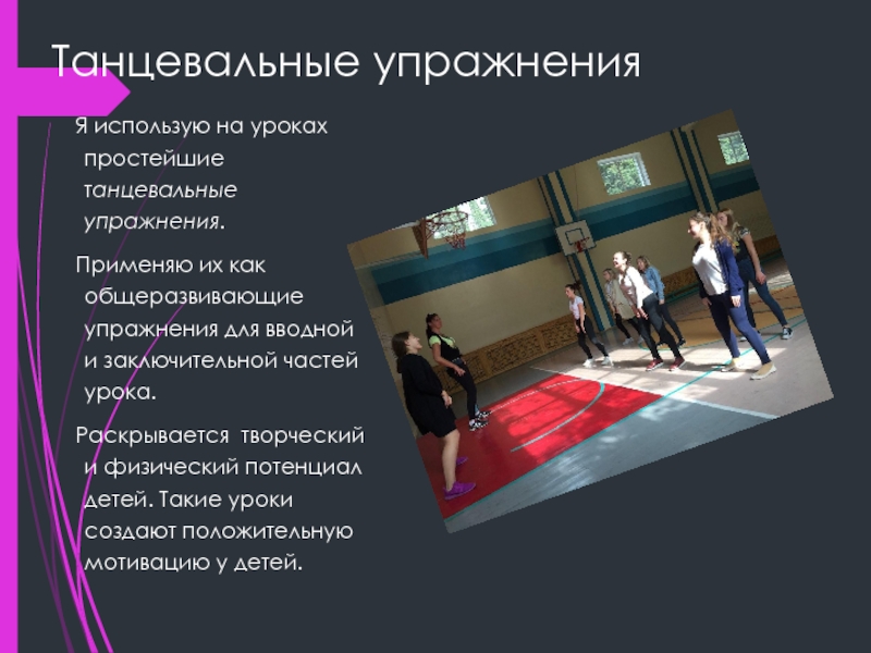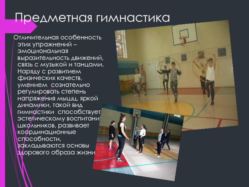 связь с музыкой и танцами. Наряду с развитием физических качеств, умением сознательно регулировать степень напряжения мышц, яркой динамики, такой вид гимнастики способствует эстетическому воспитанию школьников, развивает координационные способности, закладываются основы здорового образа жизни.
