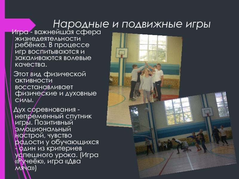 Дух соревнования - непременный спутник игры. Позитивный эмоциональный настрой, чувство радости у обучающихся - один из критериев успешного урока. (Игра «Ручеёк», игра «Два мяча»)