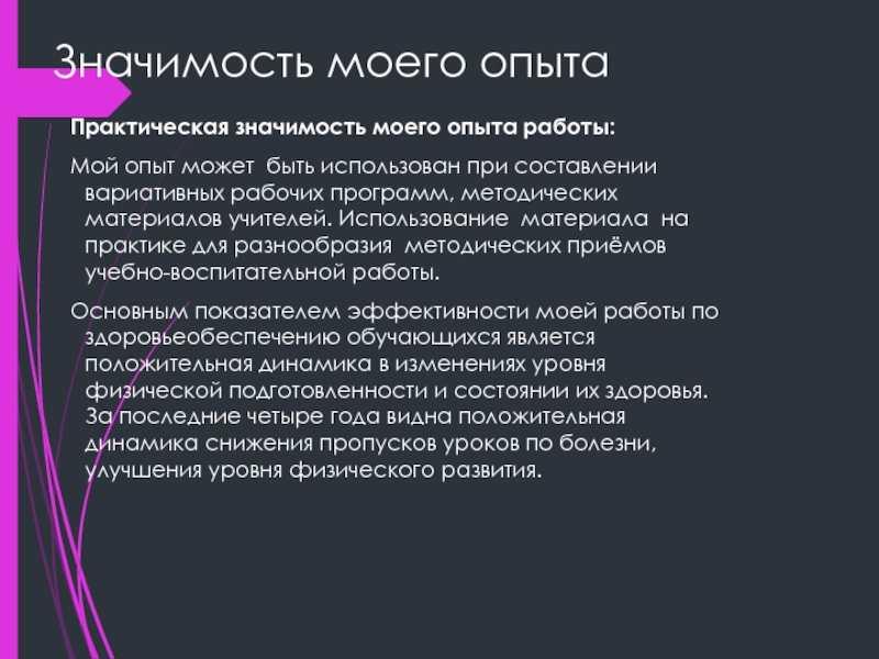 Основным показателем эффективности моей работы по здоровьеобеспечению обучающихся является положительная динамика в изменениях уровня физической подготовленности и состоянии их здоровья.