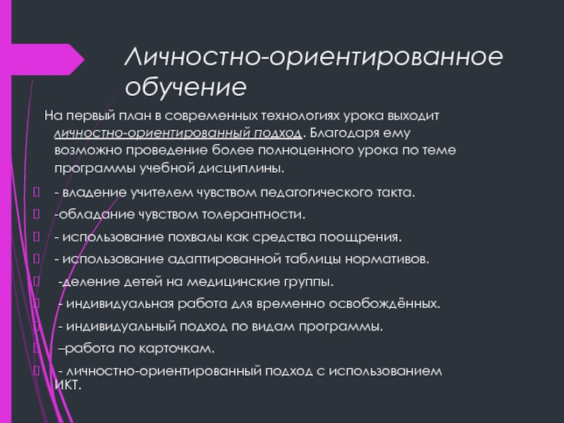 выходит личностно-ориентированный подход. Благодаря ему возможно проведение более полноценного урока по теме программы учебной дисциплины.