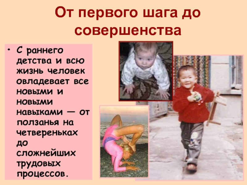 овладевает все новыми и новыми навыками — от ползанья на четвереньках до сложнейших трудовых процессов.