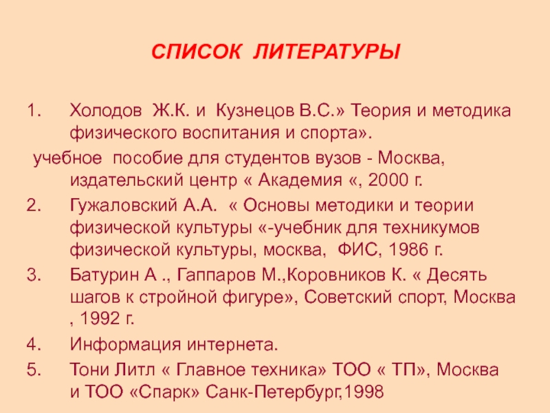 Гужаловский А.А. « Основы методики и теории физической культуры «-учебник для техникумов физической культуры, москва, ФИС, 1986 г.