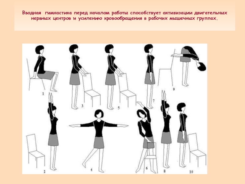 Слайд 11Вводная гимнастика перед началом работы способствует активизации двигательных нервных центров и