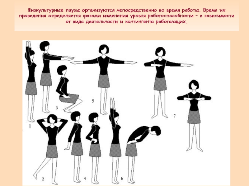Слайд 13Физкультурные паузы организуются непосредственно во время работы. Время их проведения определяется