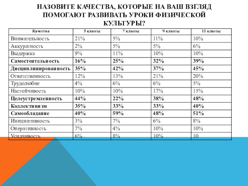Слайд 13Назовите качества, которые на ваш взгляд помогают развивать уроки физической культуры?
