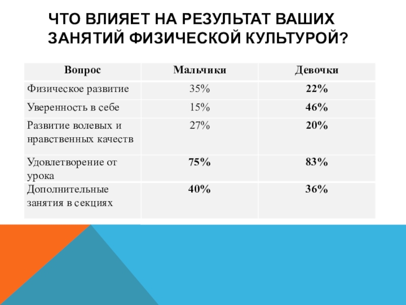 Слайд 12Что влияет на результат ваших занятий физической культурой?